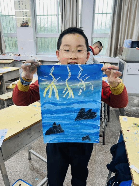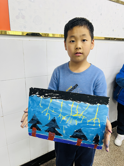 在科学美术社团中,小学教育专业的员工和附小三四年的小朋友们一起通过猜谜语导入,学习了有关闪电的产生原因,闪电的特征及其危害等相关知识,通过“水油分离”的实验学习了绘画相关技巧,一起完成了一幅幅各式各样闪电的画作,同学看见自己也画出了神奇的作品惊叹不已,纷纷表示这样的课堂很有趣。