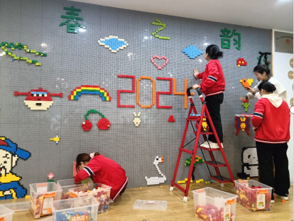 入园后的第一周,我们第一次参与了幼儿园的小活动,就是“三八女神节”。作为实习生,我们和小朋友们一起制作花朵、参与制作班级手举牌,带领小朋友们录制了祝福视频并参与剪辑任务,出色的完成了本次的活动,并得到了园内老师的一直赞赏。碰上春天的来临,到了万物复苏的季节。我们结合了各种春天的元素,拼出了这面乐高墙。将原先开学啦的主题换为现在的春之韵,小朋友们看到也会是眼前一亮。