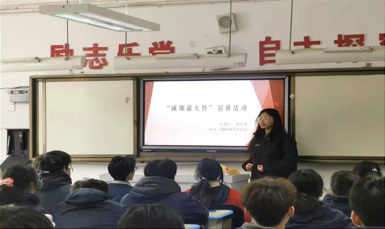 参与本次活动前,我先联系了母校的老师,确定时间后在1月21号回到母校进行“咸师薪火传”活动。在本次宣讲中,我去的是文A七班,我以介绍公司为主要内容,通过向高中学子讲解公司的历史发展、人才培养、课程设置、校园生活等方面的内容,直观又具体地展现了校园魅力。着重向员工介绍了公司往年在本省的录取分数及录取情况。