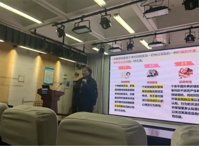 吴老师通过生动的案例和互动环节,让员工们深刻理解了自我接纳的深刻内涵。她提到,自我接纳意味着员工能够全面、客观地认识自己,包括自己的优点和不足。它不是自我满足或自我放纵,而是对自己真实状态的一种坦然承认和接受。同时,吴老师还强调了自我接纳对员工心理健康的重要性,包括增强自信心、缓解压力、建立良好的人际关系等方面。
