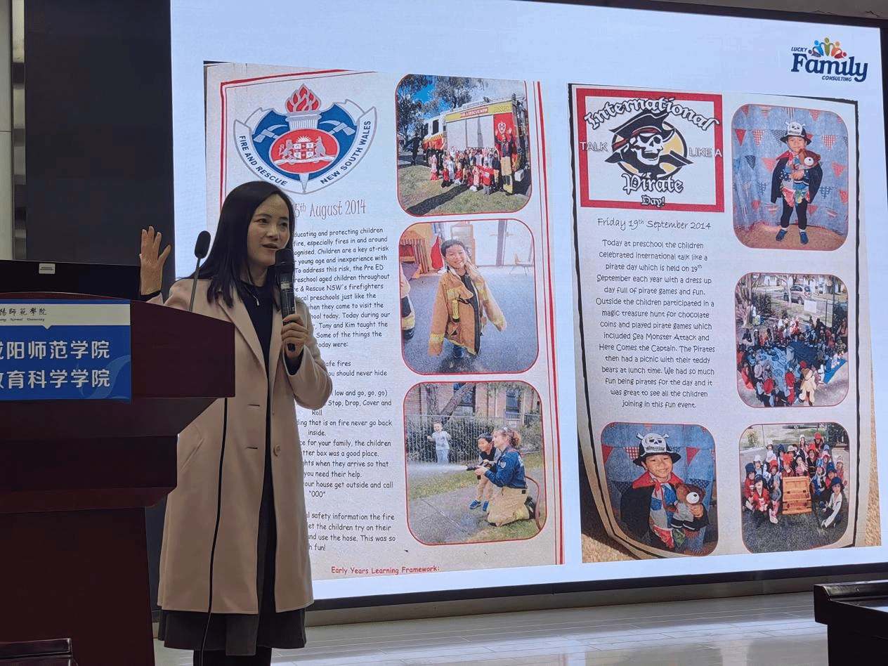 LUCKY ZHAO老师从事澳洲教育心理亲子家庭工作24年,系澳大利亚华人亲子教育与家庭关系指导师、国际神经语言学执行师、美国正面管教协会家长讲师、七田真国际教育高级培训师。下午的学术报告中,LUCKY ZHAO老师主要强调了儿童在任职、情绪发展和社会性发展方面面临的挑战,详细介绍澳洲“以儿童为中心”的学前教育理念,提出了职前师范生教学能力培养的新思路。