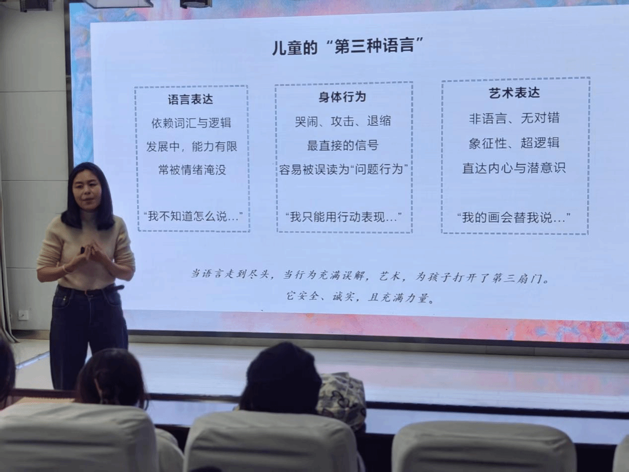 在第二部分,主讲人深入解析了艺术疗愈的三大机制:通过“非语言桥梁”绕过心理防御,实现情绪的安全宣泄;通过“秩序重构”帮助儿童从混乱中建立掌控感;借助“象征与整合”在隐喻中完成内心冲突的转化。这些机制共同作用,助力儿童情绪疏导、自我认知与心理弹性的发展。