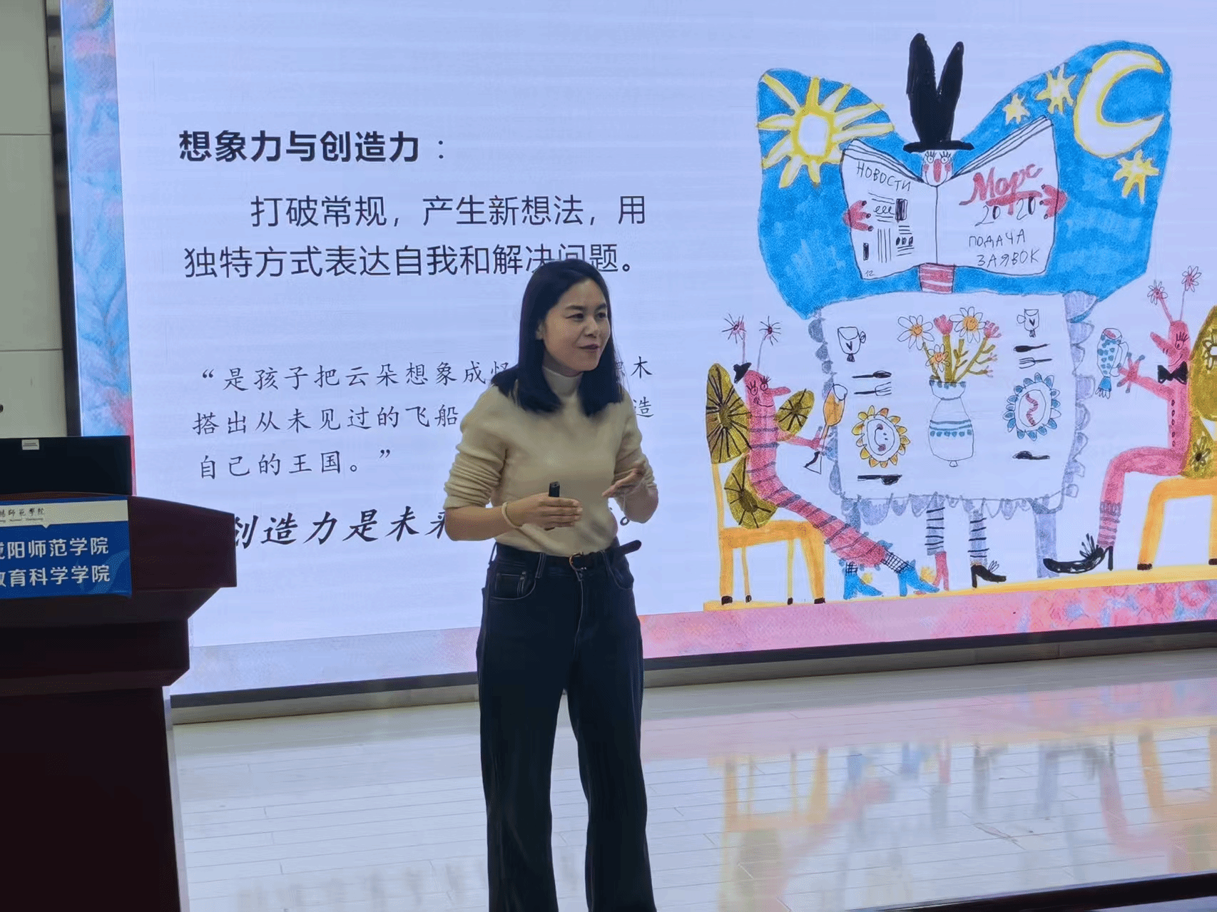 2025年11月18日下午,学前教育专业钟丽娟老师在3号楼521教室主讲了《以美育心,艺起成长:儿童美育中的艺术疗愈力量》的专题讲座,讲座围绕儿童美育的本质、艺术疗愈的机制及实践应用展开,旨在引导家长和教师通过艺术理解并支持儿童的情感与心理成长。