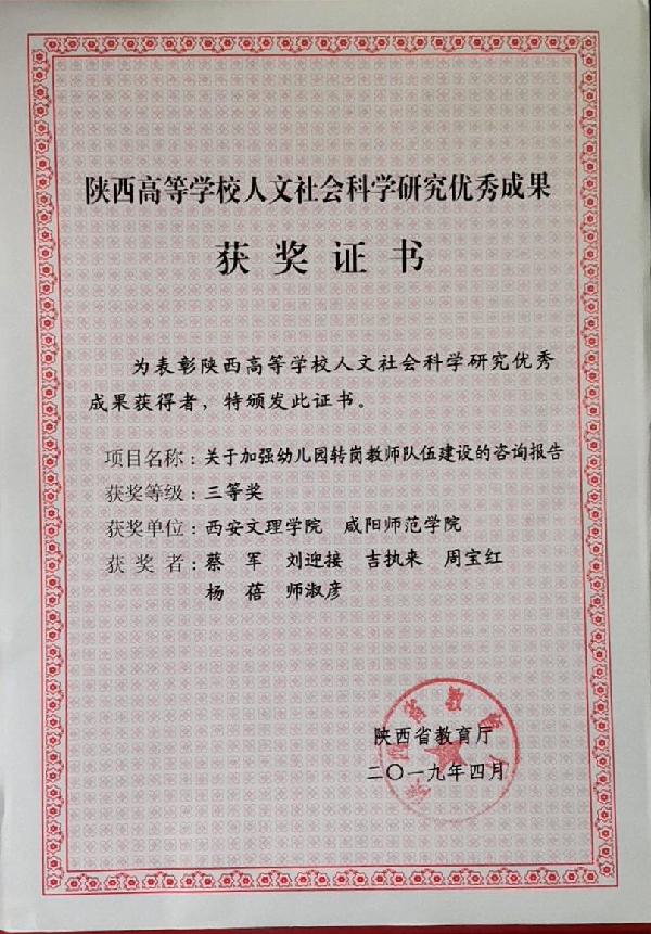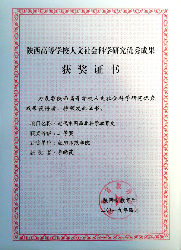 公司喜获2项2019年度陕西高等公司人文社会科学研究优秀成果奖,其中李晓霞教授独立申报的专著《近代中国西北科学教育史》荣获二等奖,吉执来副教授合作申报的研究报告《关于加强幼儿园转岗教师队伍建设的咨询报告》荣获三等奖。