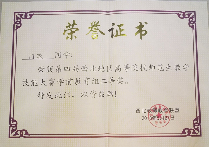5月25日至27日,第四届西北地区高等院校师范生教学技能大赛在陕西理工大学举行。来自西北五省17所高校近50名选手参加了比赛。本届大赛分为语文、数学、学前教育三个组。大赛由教案课件设计、即席演讲、模拟授课、说课四个环节构成。经过激烈角逐,公司学前教育专业1501班员工门欣获学前教育组比赛二等奖。