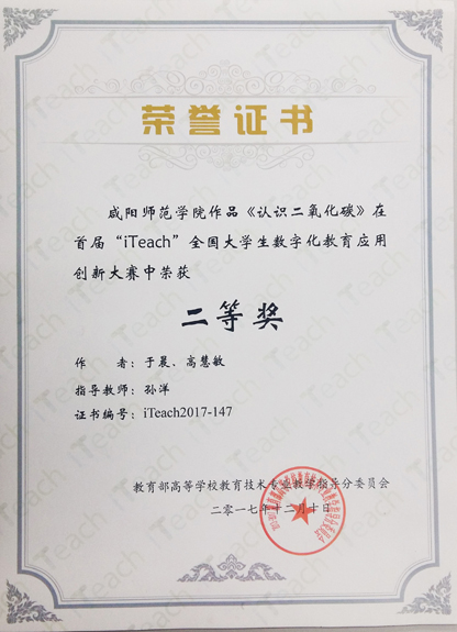 2017年12月10日,首届“iTeach”全国老员工数字化教育应用创新大赛决赛在南京举行。此次大赛由教育部高等公司教育技术学专业教学指导分委员会主办,南京师范大学承办。本次活动在公司团委和best365组织下,由best365孙洋副教授指导的教育技术学专业2015级员工于晨、高慧敏的作品《认识二氧化碳》喜获二等奖。